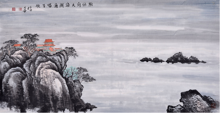 王立全先生的这幅大气山水画《胸怀向大海 潮涌唱天歌》,山河壮美,波涛滚滚,气势宏伟,磅礴大气,通过此幅画作表达了作者以景托志、满怀希望的进取精神,较易适合办公室悬挂装饰,彰显大气之感。