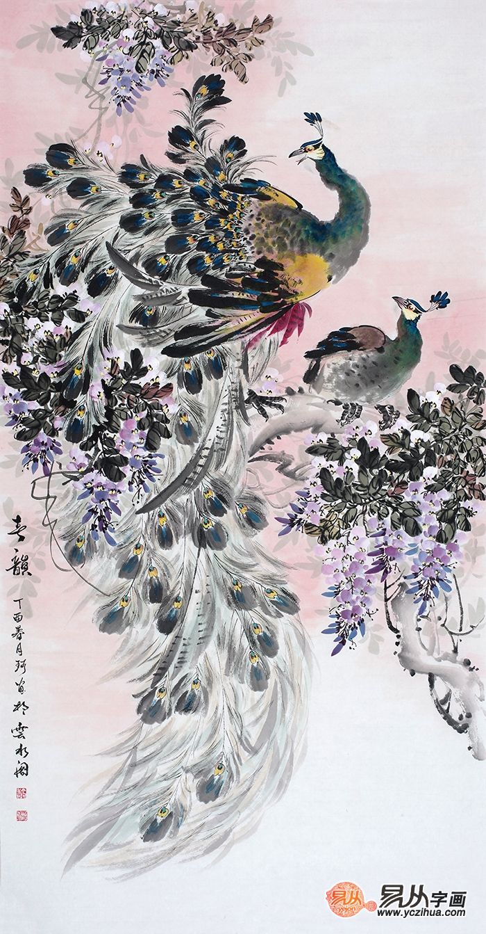 经典走廊玄关挂画:丁珂孔雀紫藤图《春韵》