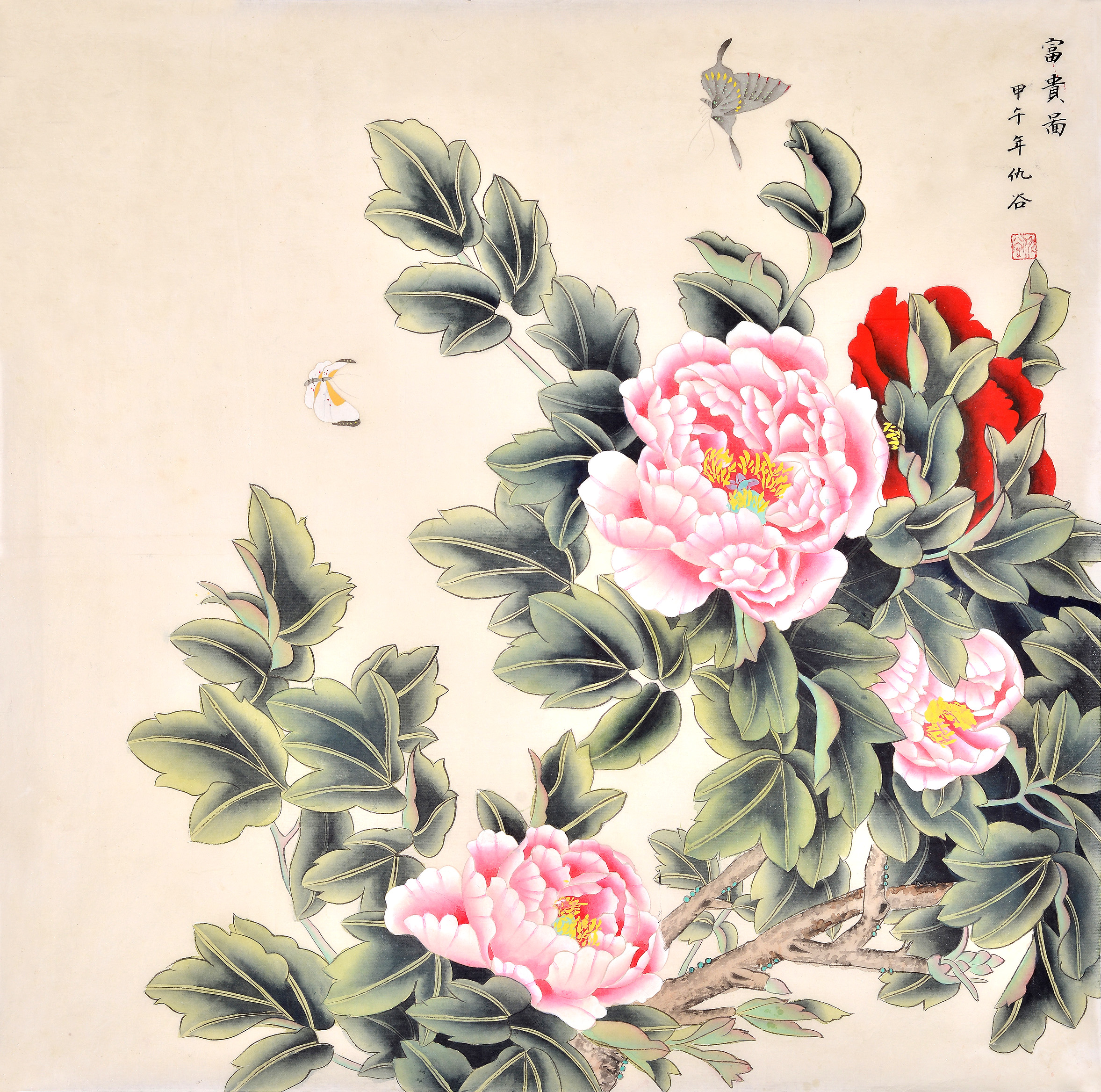 国花牡丹被称为“花中之王”,因为喻意富贵吉祥,所以一直深受大家的喜爱。以牡丹为内容的花鸟画非常适合作为装饰画挂在客厅和卧室。易从网网推荐作品: 仇谷四尺斗方花鸟画牡丹蝴蝶《富贵图》